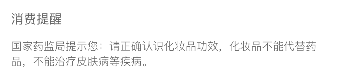 【消费提醒】:国家药监局提示您:请正确认识化妆品功效,化妆品不能替代药品,不能治疗皮肤病等疾病。