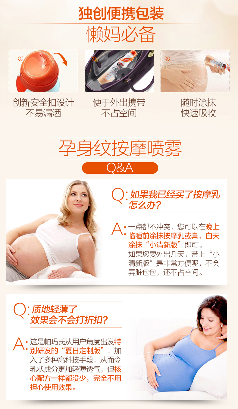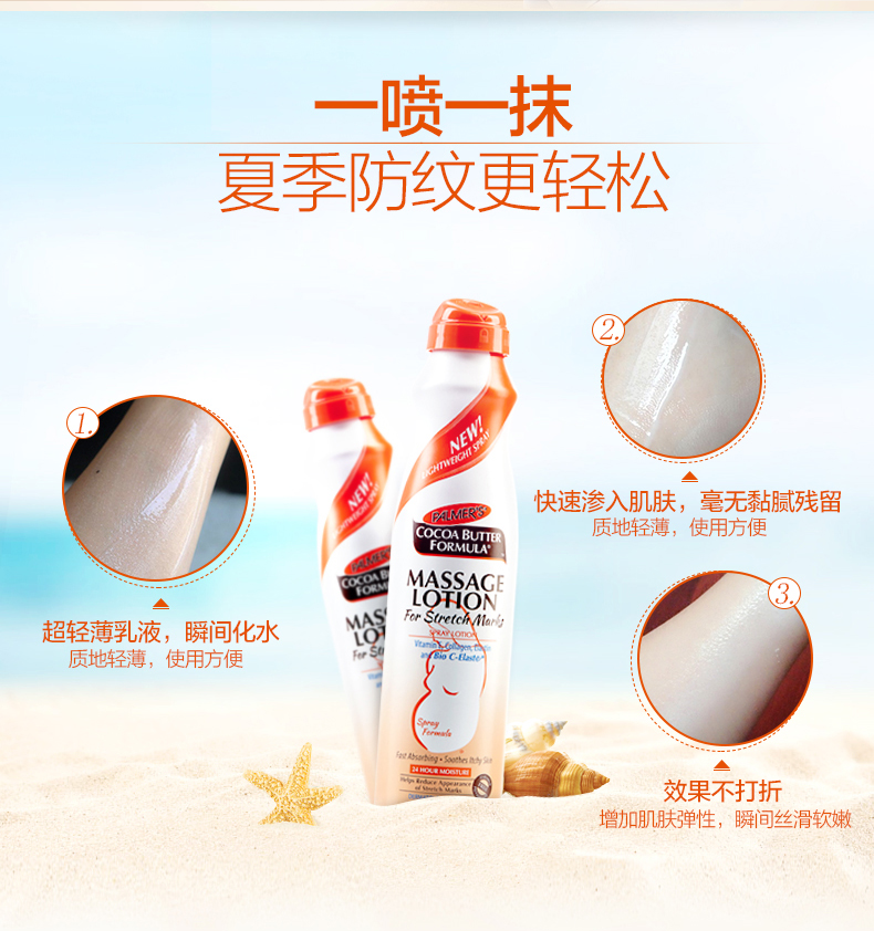 很方便 轻轻一喷就好了 夏天用喷雾刚刚好 喷上凉凉的 味道也很好闻 用了几天了 坚持使用 准备用完继续买 但愿不会起妊娠纹 好评