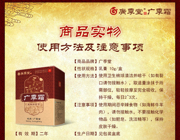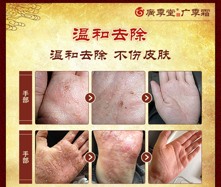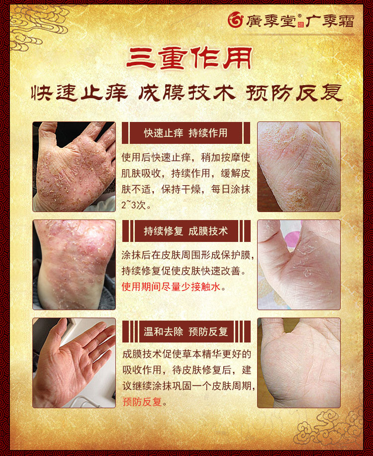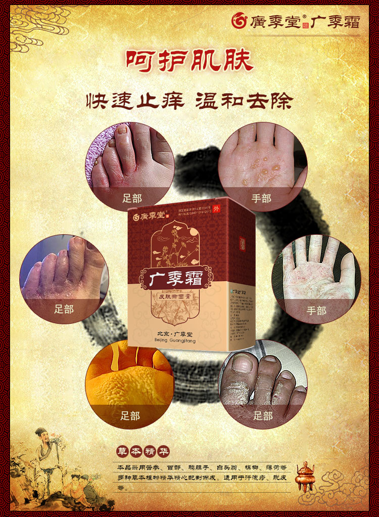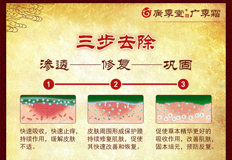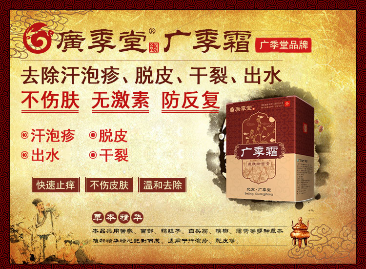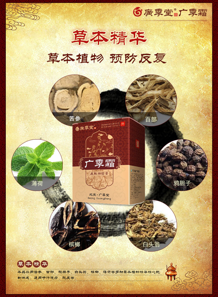 广季堂广季霜采用上等中药材:苦参、白鲜皮、蛇床子、土荆皮、地肤子等植物精华,经存放祛燥后精细炮制而成。深入病源,清除体内湿热之气,调节皮脂分泌和神经传导差异,从根本上消除神经性皮炎、脂溢性皮炎、过敏性皮炎等,使用以后立刻缓解皮肤瘙痒症状,减少油脂分泌。从而减少挠抓,减轻痛苦。广季堂广季霜采用辨证施治法,遵循皮炎消炎、杀菌、止痒、去脂的治疗原则。从病理着手,深层调节皮肤代谢,抑制病菌的滋生。涂抹到患处后,直达病灶,消除瘙痒、红肿、疼痛、红斑、皮屑、出水等症状,促进皮肤快速修复。抑菌止痒,抑杀白念菌、金葡菌等多种皮肤有害菌,促进皮肤修复。适用于皮炎(脂溢性皮炎、神经性皮炎、过敏性皮炎等)、癣、汗疱疹、湿疹等症状皮肤。